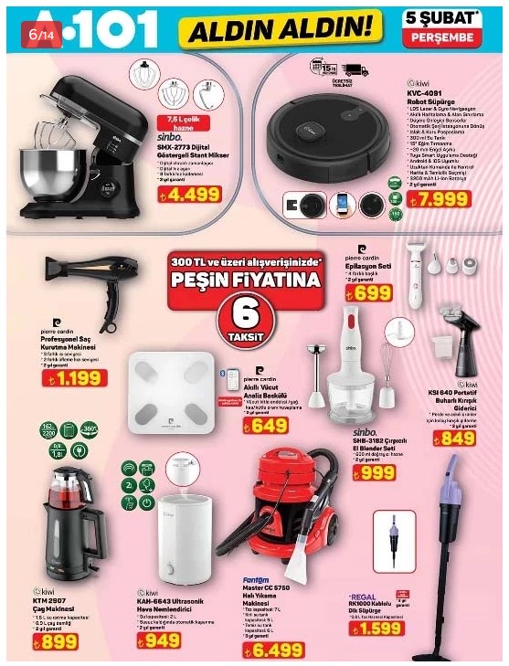 Perakende zinciri A101, 5 Şubat 2026 Perşembe günü raflarda yerini alacak yeni aktüel ürünler kataloğunu yayınladı. Teknolojiden elektrikli araçlara, evcil hayvan ürünlerinden küçük ev aletlerine kadar geniş bir yelpazenin bulunduğu listede, 229 bin TL’lik elektrikli araç ve robot süpürge dikkat çeken kalemler arasında yer alıyor.
