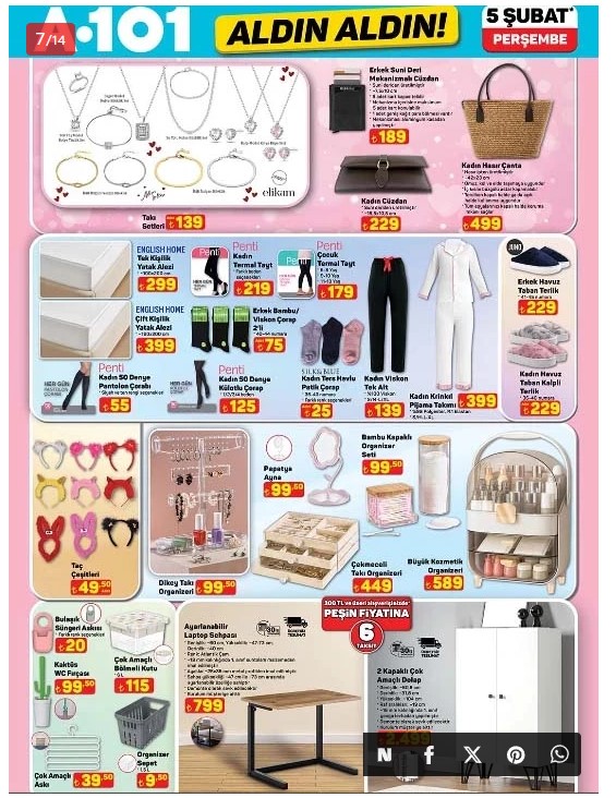 Kataloğun diğer dikkat çeken ürünleri arasında mobilya, kişisel bakım ve çocuklara yönelik oyuncaklar bulunuyor. Ev düzeni için 2 Kapaklı Çok Amaçlı Dolap 2.499 TL’den, çalışma konforunu artırmak için Ayarlanabilir Laptop Sehpası 799 TL’den satılacak.