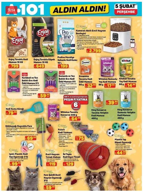 5 Şubat kataloğunda evcil hayvan sahiplerini ilgilendiren teknolojik ve temel ihtiyaç ürünleri de geniş yer buldu. Evde yokken dostlarını takip etmek ve beslemek isteyenler için Kameralı Akıllı Evcil Hayvan Besleyici 2.799 TL fiyatla satışa sunulacak. Ayrıca 10 KG Tavuklu Köpek Maması 649 TL, 10 L Sabunlu Kedi Kumu 199 TL ve İki Toplu Kedi Oyun Tüneli 129 TL fiyat etiketiyle reyonda yerini alacak.