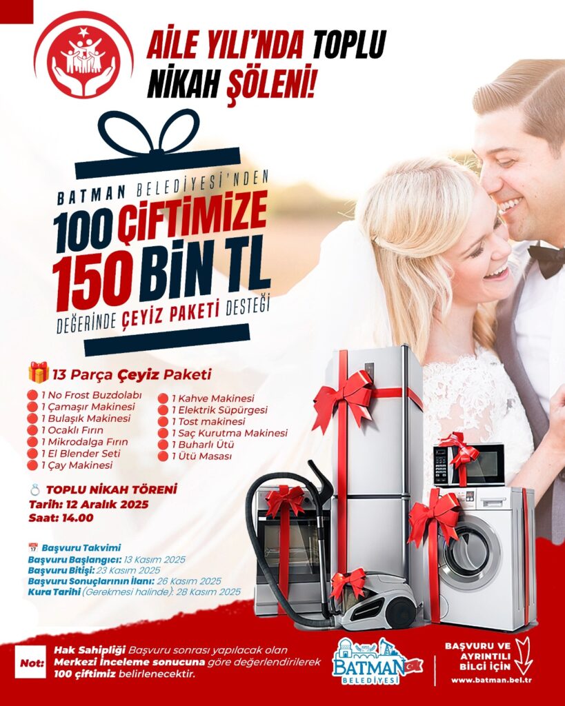 Başvuru sayısının 100’den fazla olması durumunda, hak sahibi çiftler Noter huzurunda yapılacak kura ile belirlenecek. Başvurular 13-23 Kasım tarihinde yapılacak. Toplu Nikâh Töreni ise 12 Aralık 2025 Saat 14.00’te düzenlenecek. Başvurular, Batman Belediyesi Sosyal Yardım İşleri Müdürlüğü Ek Hizmet Binası (Bahçelievler Mahallesi 1620. Sokak) üzerinden yapılacak.
