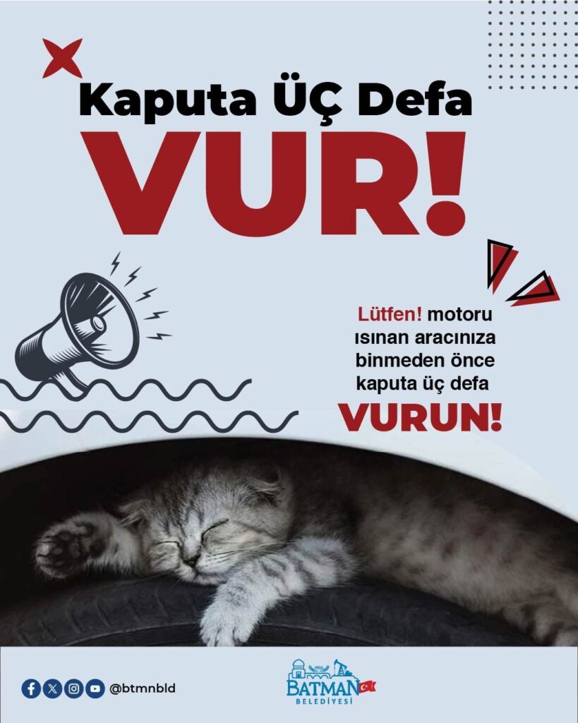 Batman Belediyesi Veteriner İşleri Müdürlüğü, kış mevsiminin etkisini artırmasıyla birlikte, soğuktan korunmak için araç motorlarına sığınan sokak hayvanlarının zarar görmemesi adına sürücülere çağrıda bulundu.